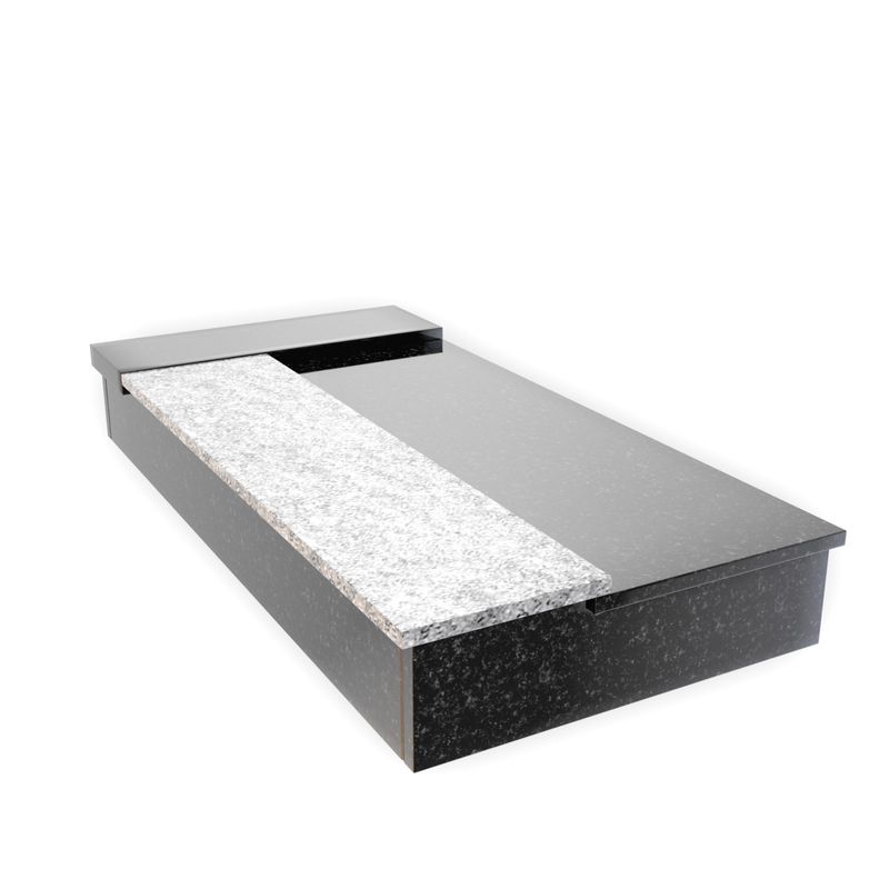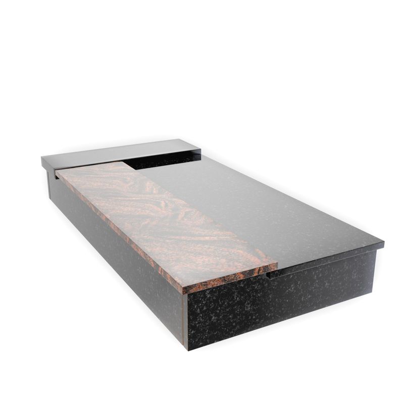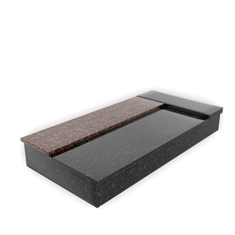 Надгробие на одиночное захоронение, из двух видов гранита, из семи элементов. Верхние плиты строгих форм, плита из цветного гранита может быть как выше, так и ниже.