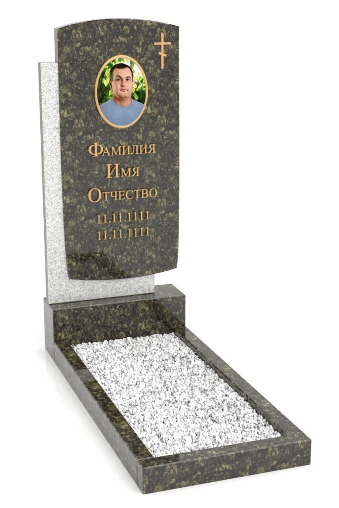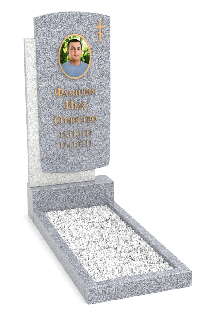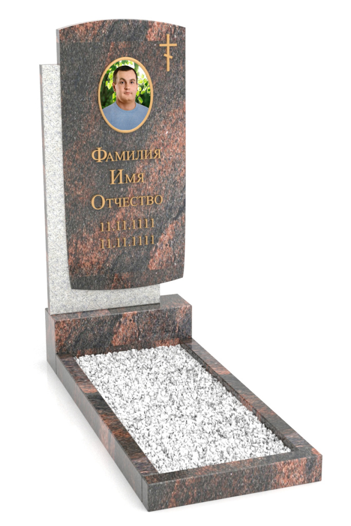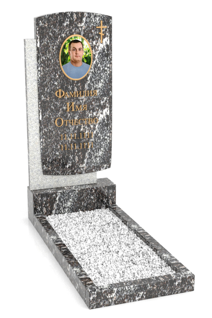 Памятник вертикальный из гранита, форма прямая с небольшими изгибами сверху и сбоку и неполированным резом с боку и снизу. В комплект входит подставка и три бруска для цветника.