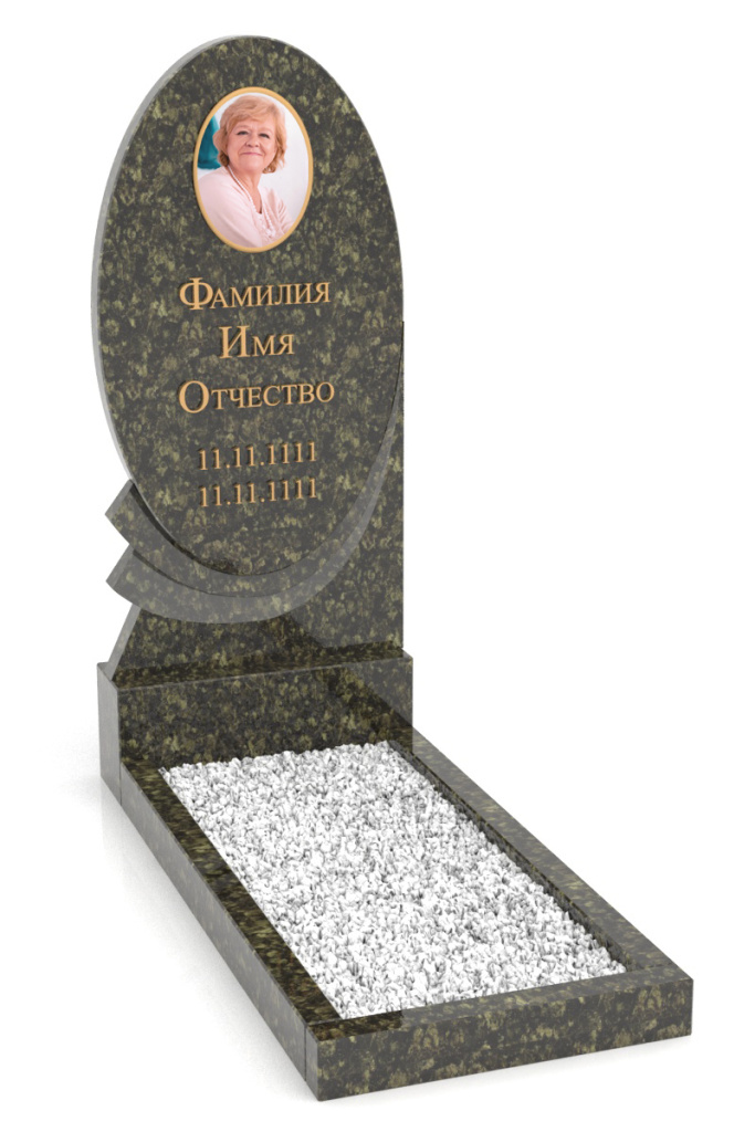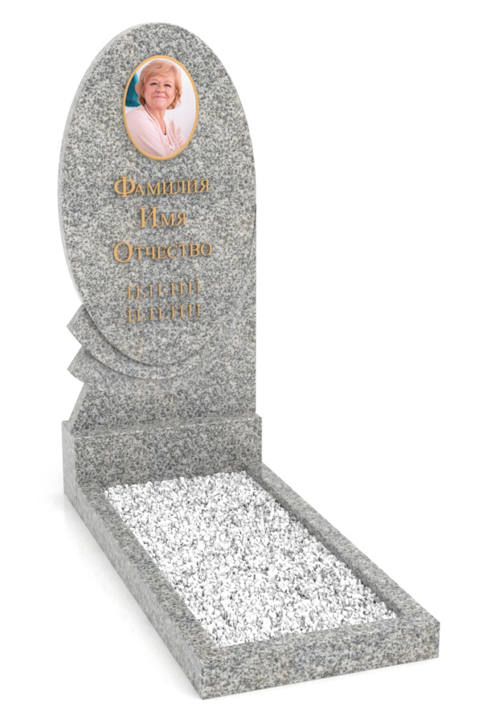 Памятник вертикальный из гранита, округлая с небольшими веерами снизу. В комплект входит подставка и три бруска для цветника.